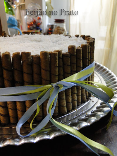Montagem – Divida o bolo em três partes, coloque dentro do aro de bolo a primeira parte, molhe com a calda e coloque um pouco do recheio e repita o processo fechando com a última camada do bolo – leve para gelar por pelo menos 6 horas. Retire da geladeira vire o bolo no prato que vai servir e cubra com um ganache de chocolate que nada mais é do que : 200g de chocolate meio-amargo – 1 caixinha de creme de leite – 1 colher (sopa) de rum. Derreta o chocolate no microondas ou em banho-maria e junte o creme de leite (que deve estar aquecido também) misture bem até ficar brilhante e some então o rum. Aplique no bolo e para decorar eu grudei nas laterais biscoitos e por cima cobri coco em flocos – dei um laço de fita e estava pronto.
