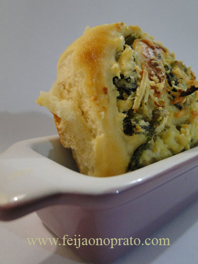 Tire o filme, dê alguns soquinhos de leve na superfície e tire a massa do recipiente e coloque na bancada enfarinhada – abra a mesma em um retângulo e aplique o recheio que nesse caso foi: ricota amassada – espinafre (que foi previamente refogado com os temperinhos de sua preferência e devidamente escorrido e picadinho) –  creme de leite (para 300g de ricota eu utilizei 140g de creme de leite) – pimenta moída na hora – sal e azeite honesto – coloquei um pouquinho de azeitonas picadinhas. Espalhe esse recheio por toda a massa e enrole como se fosse um rocambole e nesse momento corte os caracóis em uma largura de +/- 2 dedos – coloque em assadeira enfarinhada e pincele com egg wash (mistura de ovo e água) polvilhe parmesão ralado e leve ao forno moderado até que esteja devidamente assado e douradinho.