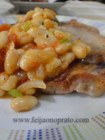 Aqueça uma frigideira grande de fundo pesado e regue com azeite e deixe sofrer uma cebola picadinha com dois dentes de alho bem picados – assim que a cebola murchar junte 3 pimentas dedo-de-moça sem sementes e bem picadas tempere com sal e some uma lata de tomates pelados picados deixe esses ingredientes se agregarem e formar um molhinho bem grossinho nesse momento junte uma lata de feijão branco (já com o líquido drenado) e dexei que esse feijão pegue os sabores do molho verifique o tempero – polvilhe com salsa e cebolinha picadinha e sirva com uma carne. A carne escolhida dessa vez foram umas belas bistecas suínas que encontrei no supermercado.