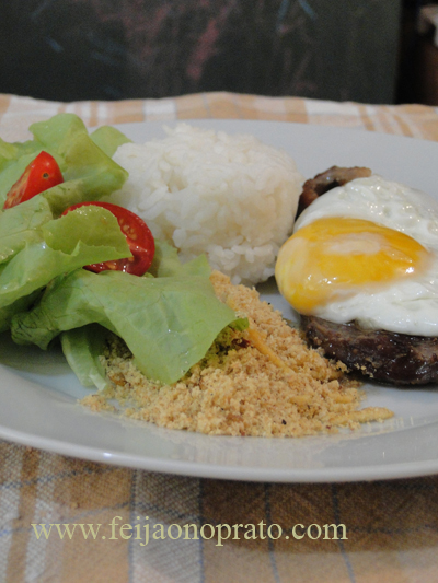 Tem segredo não amiguinha é o seu bifinho de todos os dias, com  um ovinho de gema molhinha repousado por cima e para acompanhar arroz branco , salada e farofa e no mais só muito amor mesmo.