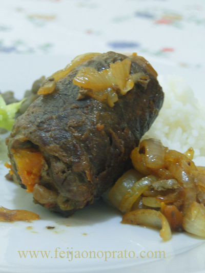 Quer fazer?! Anote aí: bifes de coxão duro (a quantidade que desejar), palitinhos de cenoura, vagem cortadas apenas na metade, palitinhos de bacon, palitos de dente para prender e para temperar vai: sal, pimenta moídos na hora e um pouquinho de ervas finas. Tempere os bifes, coloque o recheio em cada um, enrole e prenda com os palitos. Aqueça uma panela de pressão e regue com um bom fio de óleo de cozinha, depois de bem quentinha coloque os bifes para dourar – quandos os mesmo já estiverem bem bronzeados, dá cor do pecado você some um pouco de água quente e tampe a panela e deixe cozinhar até secar todo líquido , quando secar abra a panela teste com auxilio de garfo a maciez da carne se já estiver macia, então some uma cebola cortada em rodelas (no corte da cebola do seu tradicional bife acebolado) e deixe dourar – assim que estiveram prontas retire a carne do fogo e sirva quentinho com arroz, feijão e salada de folhas.