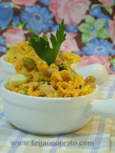 Cadê a turma da farofa aí gente? Ontem eu tive um dia difícil, saí para levar o Enzo ao médico pois o mesmo não estava bem, chorava (ou melhor gritava) o tempo todo – quando cheguei lá depois de um exame e outro o diagnóstico: Sinusite, então voltamos pra casa, depois de passar na farmácia e me conformar com a situação de que o Enzo iria novamente tomar corticóide mesmo tendo parado apenas uma semana. Mas a vida continua e quando chegou a hora do jantar eu precisar de algo rápido para acompanhar uma carne de porco douradinha na panela que foi sobra do almoço amigos. E revira daqui e dali me lembrei dessa receita que já estava na minha listinha de espera – eu sempre tenho latas ou caixinhas de soja cozida, grão de bico, feijão e tals, para executar um acompanhamento rápido ou uma pastinha ou até mesmo encrementar uma salada num dia que chega uma visita inesperada.