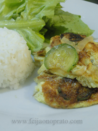 Vamos começar com um almoço simples e honesto como esse: gohan, salada e fritada de abobrinha e tudo simples assim: passe uma abobrinha no cortador pra obter rodelinhas fininhas (pessoal não tem o danado do cortador – paciência e faca mesmo) depois coloque sal e pimenta e leve para refogar numa frigideira com alho e cebola e reserve. Bata dois ou três ovos bem batidinhos com batedor de arame e tempere com toquinho bem leve de sal e pimenta e coloque 3 colheres de sopa de creme de leite deixe tudo bem misturadinho e reserve. Aqueça uma frigideira antiaderente e regue com um fio de azeite, coloque sobre a mesma os ovos batidos e por cima a sua abobrinha refogadinha e vai deixando esses ovos cozinharem até chegar no ponto, retire da frigideira, corte os pedaços e sirva quentinho.