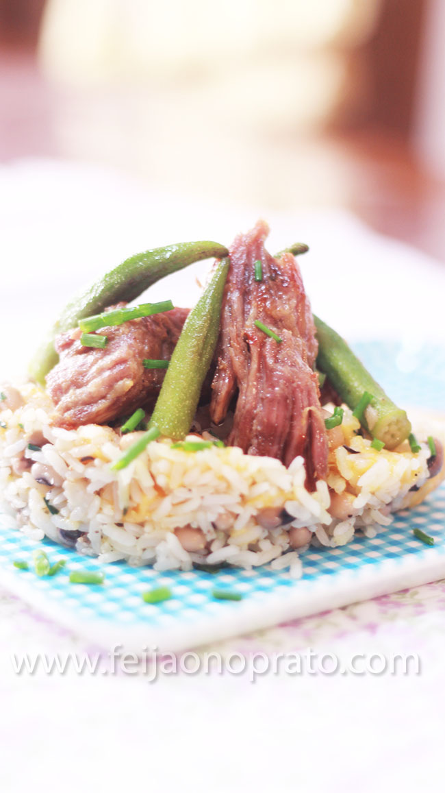 Baião de dois pode ser um prato simples, mas na minha cabeça ele não é monótono, podemos fazer várias releituras do mesmo prato e essa minha tem influência mineira pelo quiabo e goiana pela carne de panela feita lentamente e frita na própria gordura e no final tive um belo prato de baião de dois – provando mais uma vez que comida é cultura e que a união faz a força.