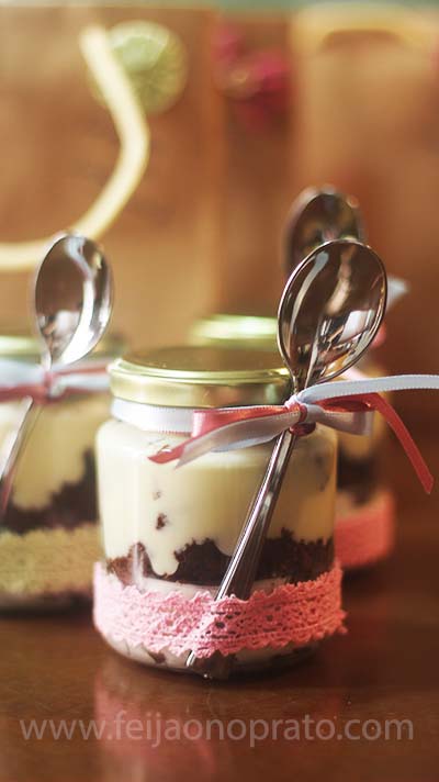 Hoje a minha escolha foram os queridos bolos no potinho – Você vai precisar de um bolo de chocolate (se não tem uma receita coringa, basta digitar na busca e vai encontrar opções), uma lata de leite condensado, uma caixinha de creme de leite, suco de dois limões e para esse creme basta misturar tudo com delicadeza e levar por 15mts na geladeira e para dar uma levantada nesse bolinho, porque delícia nunca é demais – uma xícara de creme para chantilly eu uso o profissional e também é vendido nos supermercados em caixinhas de tamanho pequeno e basta bater na batedeira até o ponto firme. Pegue o vidro limpo e coloque uma camada do chantilly , tendo sempre o cuidado de não sujar as laterais do vidro (e se sujar com cuidado limpe com um guardanapo), corte cubos de bolinho e faça uma outra camada, cubra com uma nova camada generosa de creme de limão, outro pedacinho de bolo e finalize com o chantilly. Decore o potinho, coloque uma colherzinha e finalize colocando numa fofa sacolinha. Viu como é simples mimar uma pessoa querida?!