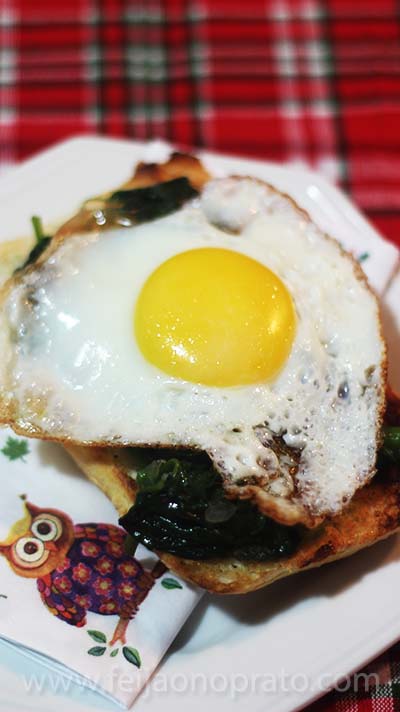 Usei metades de pão ciabatta que torrei em uma frigideira de fundo pesado e fogo baixo, ao retirar do fogo eu esfreguei um dente de alho e reservei. Com o maço de espinafre limpo e seco eu aqueci uma frigideira e dourei alho e cebola picadinha em um fio de azeite honesto e somei o espinafre e reservei. Fritei um ovo deixando a gema molinha e fui montar. Fatia de pão, espinafre e por cima um lindo ovo frito – esse foi o jantar que fez bonito na minha mesa.