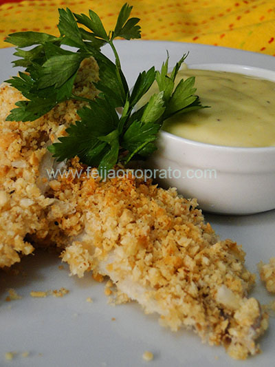 Obs – A farinha de trigo eu temperei com um toquinho de sal e pimenta moídos na hora. Super importante seguir essa ordem para empanar.