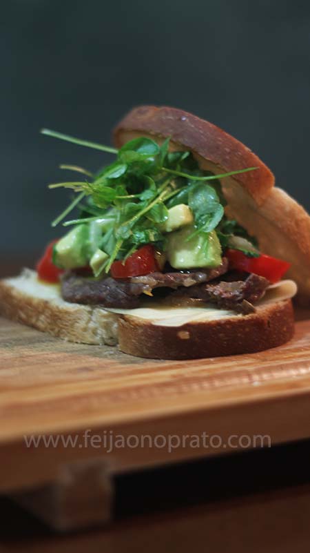 Preparo – Tinha deixado pronto uns bifes de panela, e com eles eu apenas peguei duas fatias de pão de forma e em uma delas forrei com uma fatia de queijo muçarela, cobri com um bom bifinho, fatias de tomate, uma salsa de abacate com cebola, coentro, suco de limão, sal e pimenta moídos na hora e uma boa regada de azeite, para finalizar folhinhas de mini agrião.