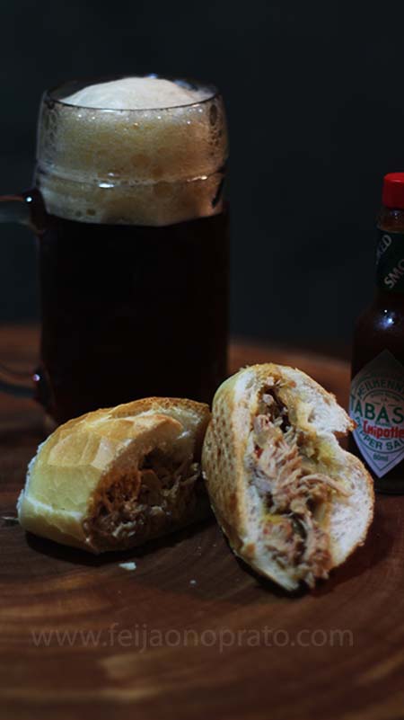 Então vamos já pra cozinha fazer o tal sanduba – Um pedaço de pernil, faça furos na peça de carne e tempere com sal, pimenta em grãos e alho sofridos no pilão, cubra com vinho e deixe marinar por 2horas – após esse tempo, pegue a peça de carne transfira para uma assadeira besunte um toquinho de azeite na mesma e cubra com o vinho que a marinou, tampe com papel alumínio e leve ao forno baixo – isso vai levar algumas boas horas lá no forno bem baixinho, quando aquele vinho secar a carne já deve estar desmanchando, então retire da assadeira e faça um fundo com cebolas em rodelas, tomates em cubos grandes, pimentão em rodelas e coloque a carne que você deve terminar de desfazer com o garfo, tampe novamente com papel alumínio e leve ao forno e deixe que esses ingredientes cozinhem e forme um molhinho grossinho e pegue o sabor da carne, então retire do forno e monte seu lanche com o pãozinho escolhido e um toquinho de uma boa mostarda.
